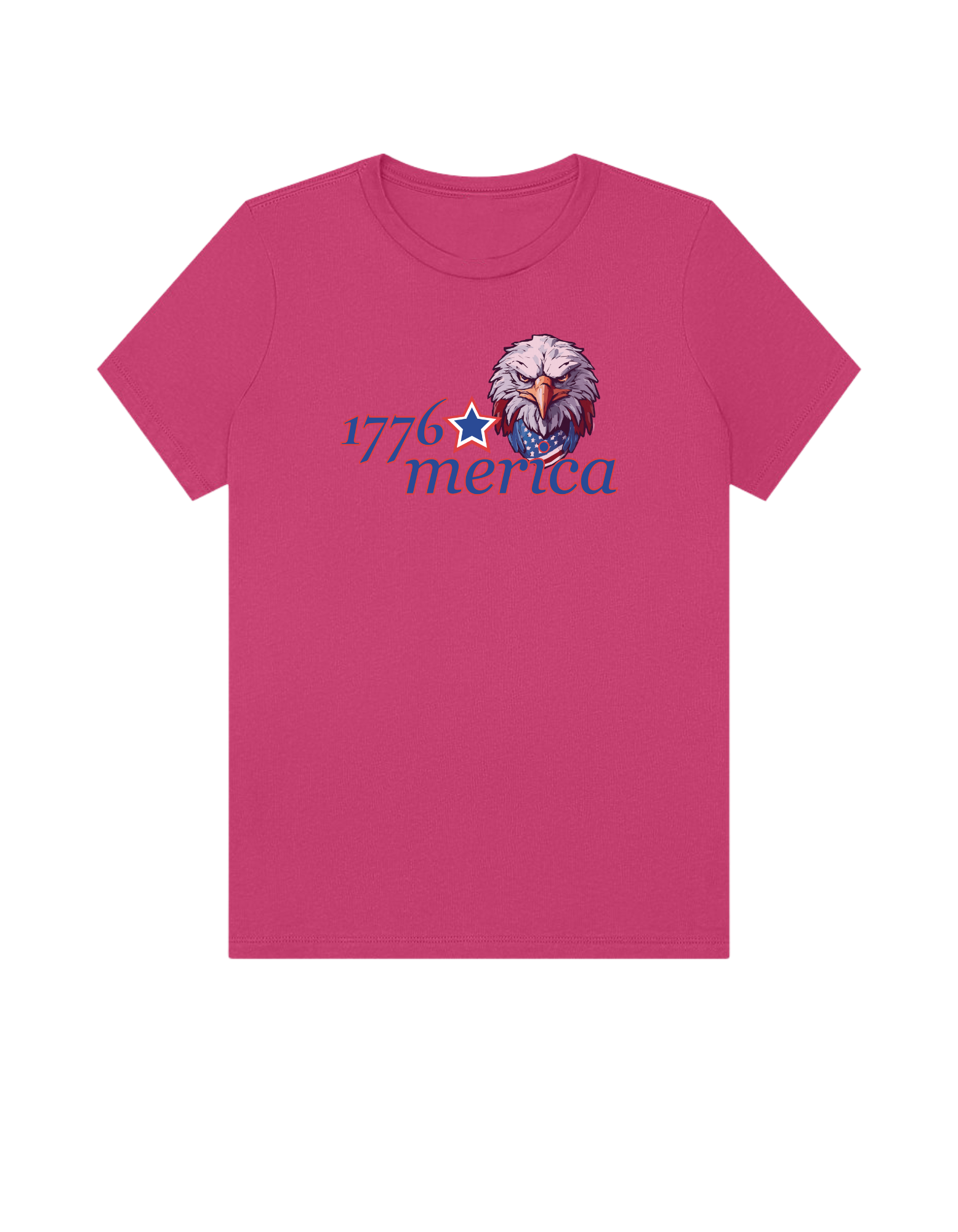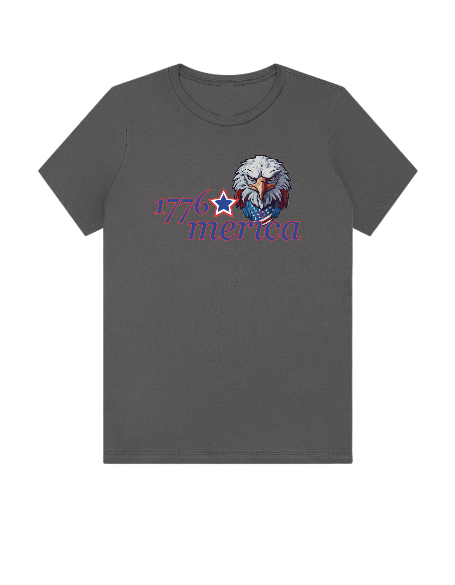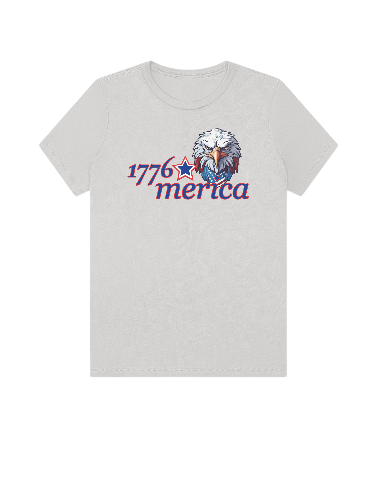 Part of our relaxed collection, this women’s fitted jersey t-shirt features a crew neck, short sleeves, and a contemporary, looser fit for effortless style. Made from super-soft 100% Airlume cotton, it feels amazing all day long with a super-smooth surface. This 1776 Merica tee features a bold, patriotic eagle design that embodies strength, pride, and American spirit.