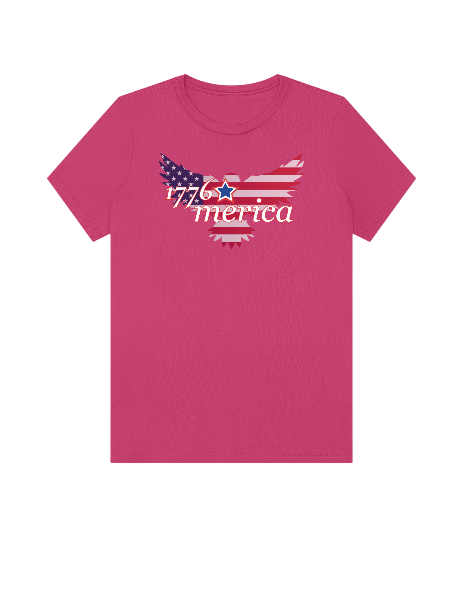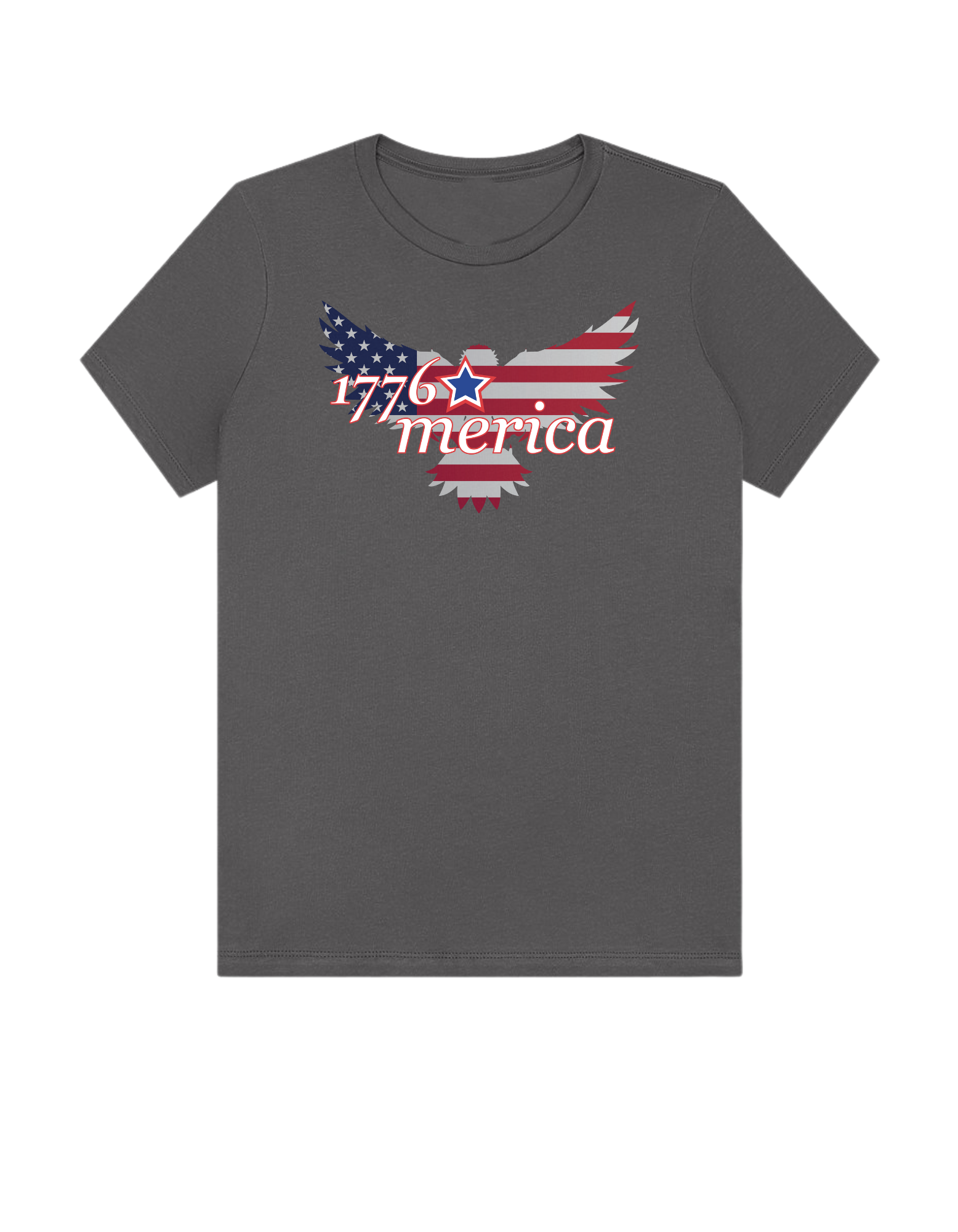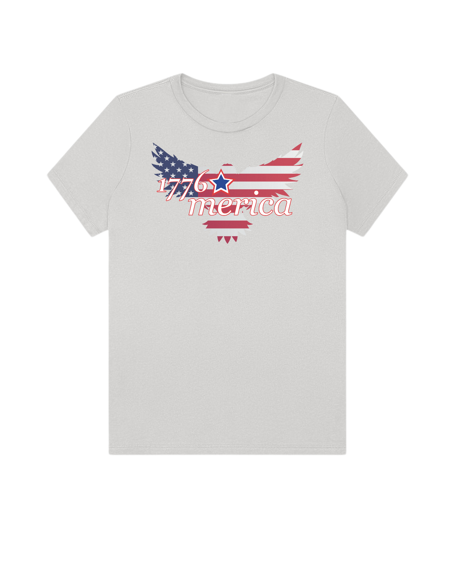 Part of our relaxed collection, this women’s fitted jersey t-shirt features a crew neck, short sleeves, and a contemporary, looser fit for effortless style. Made from super-soft 100% Airlume cotton, it feels amazing all day long with a super-smooth surface. This 1776 Merica tee features a patriotic eagle silhouette filled with stars and stripes—perfect for everyday American pride.