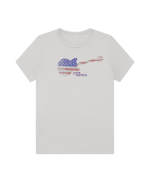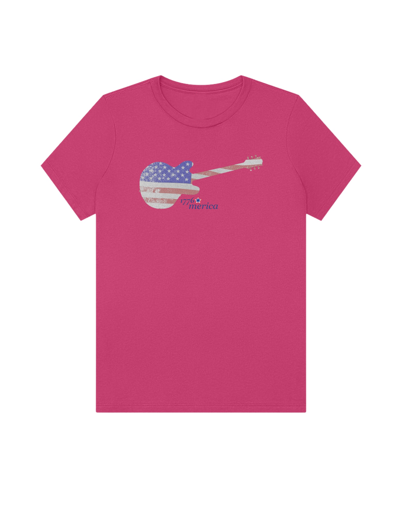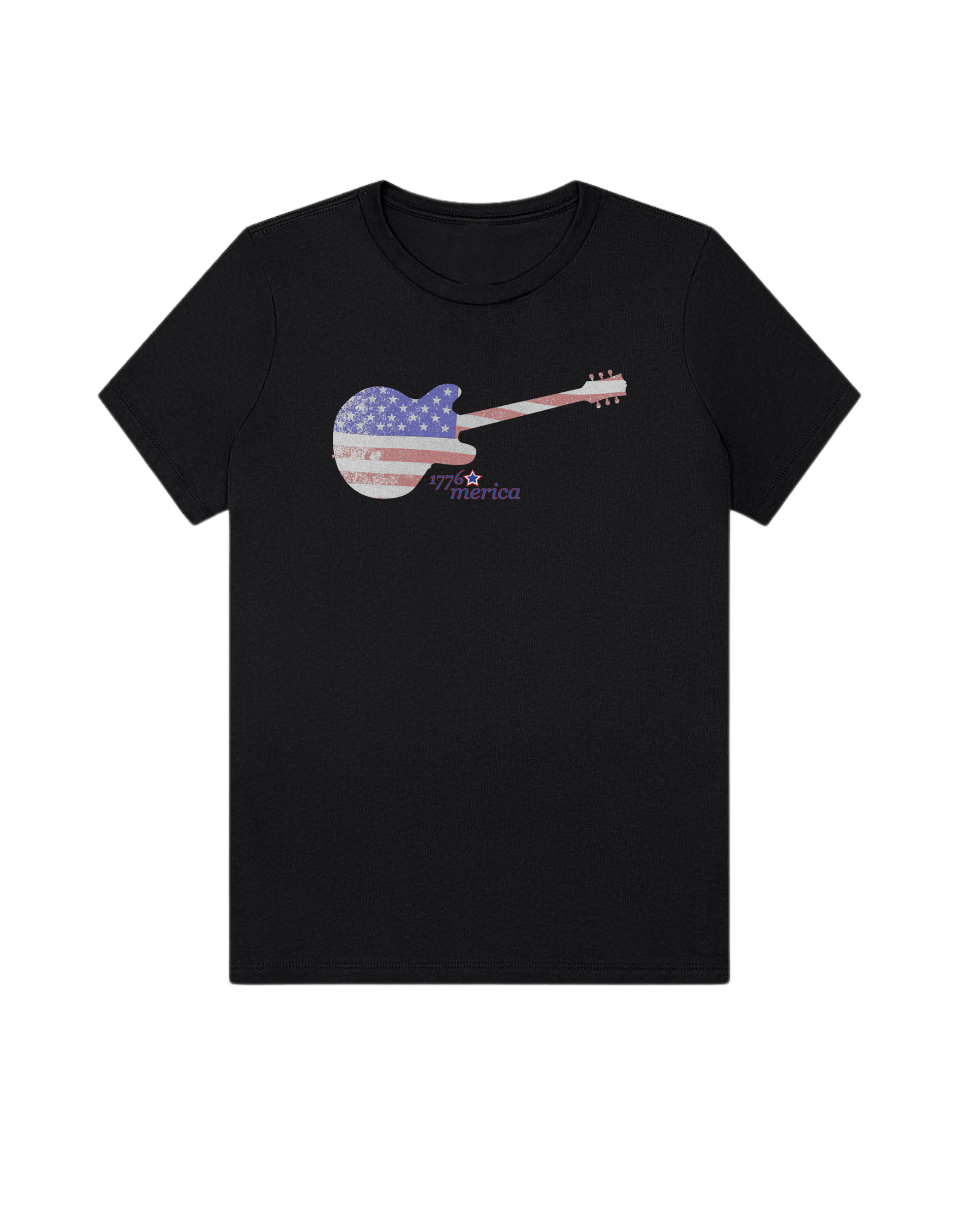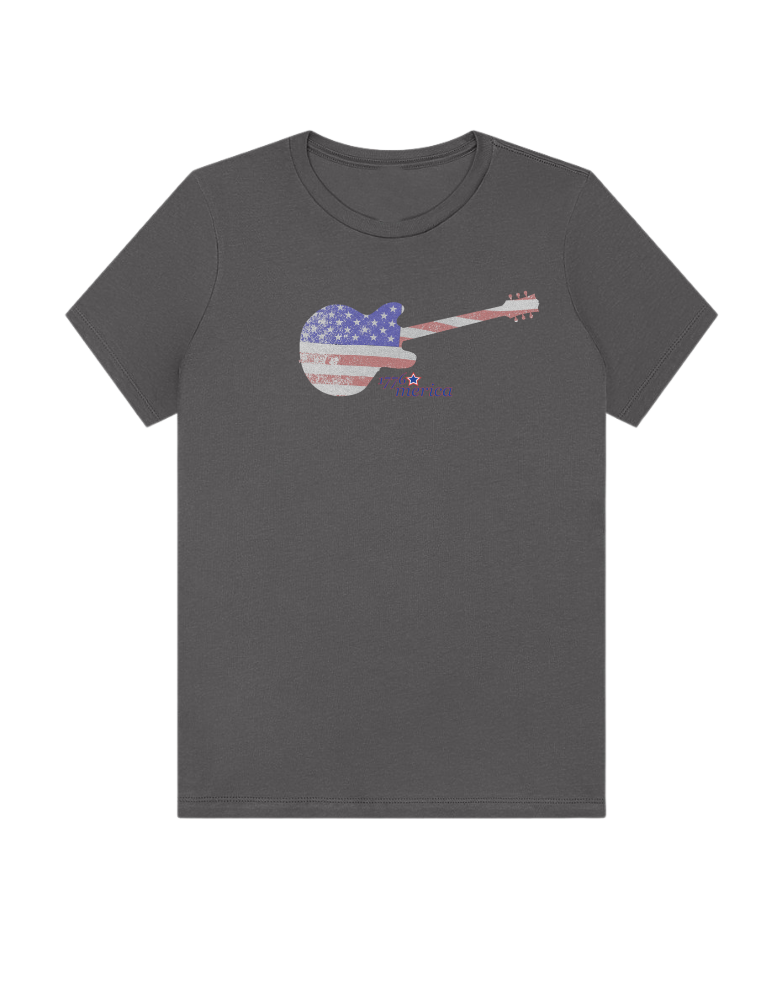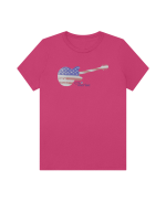 Part of our relaxed collection, this women’s fitted jersey t-shirt features a crew neck, short sleeves, and a contemporary, looser fit for effortless style. Made from super-soft 100% Airlume cotton, it feels amazing all day long with a super-smooth surface. This 1776 Merica tee features a vintage flag-print guitar—perfect for patriots who love their country loud.